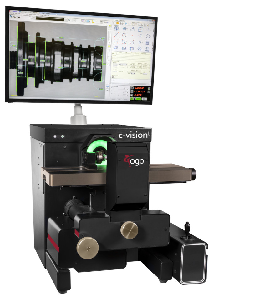 计量学家使用落地式 OGP c-vision 视频轮廓投影仪。请注意屏幕上显示的数字化零件图像,其中显示了合适的测量数据。